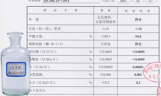 甲酸主含量≥85%,Fe≤4ppm